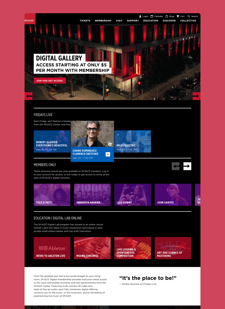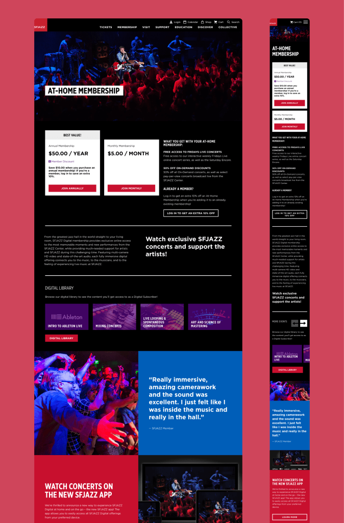 Finally, SFJAZZ wanted to improve their membership pages to make it easier for users to compare prices and benefits. Since they are increasingly producing online concerts, they also needed a way to sell access to their digital content. The result is a couple of templates that are unique, engaging, and make it simpler for potential members to make choices about which membership is right for them.