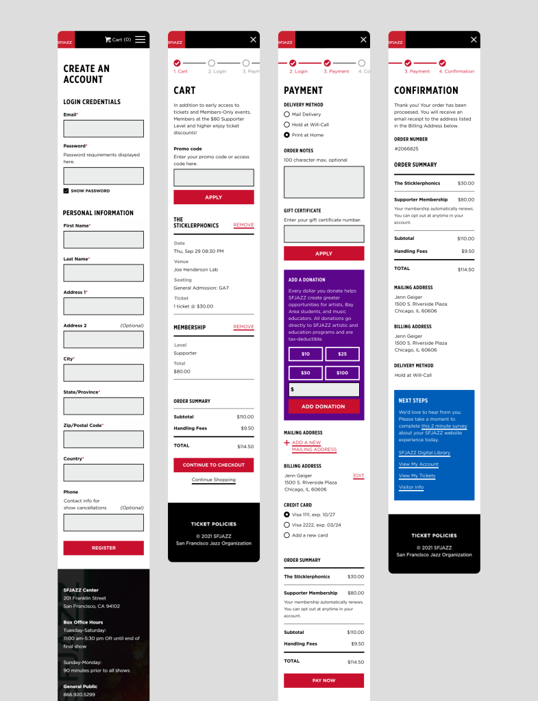 SFJAZZ wanted to audit their purchase path to see where they could improve the checkout process for their audiences. I recommended solutions and best practices, and created a simpler, shorter, more streamlined purchase path that would result in more conversions and less abandoned carts.